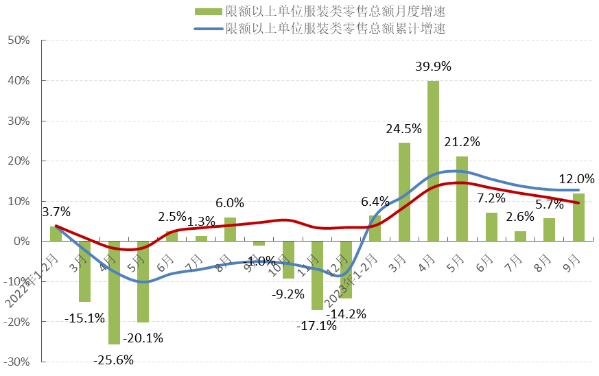 前三季度,在國家促消費系列政策持續發力顯效、消費場景全面恢復、居民收入及消費信心逐步回升等積極因素影響下,國內服裝銷售市場保持良好恢復態勢,市場活力持續回升,消費需求逐漸釋放。根據國家統計局數據,1-9月,我國社會消費品零售總額342107億元,同比增長6.8%,增速比1-6月放緩1.4個百分點。其中,限額以上單位服裝類商品零售額累計7257億元,同比增長12.8%,增速比1-6月放緩2.7個百分點。三季度限額以上單位服裝類商品零售額月度增速持續回升,7月同比增長2.6%,8月同比增長5.7%,9月同比增長12%(見圖2)。線上服裝零售增速小幅放緩,1-9月,穿類商品網上零售額同比增長9.6%,增速比1-6月放緩3.7個百分點。