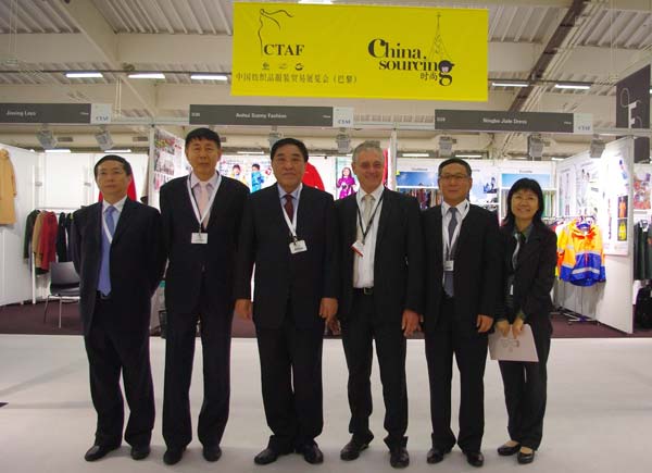 中國國際貿易促進委員會紡織行業分會副會長林云峰,中國紡織工業聯合會副會長張延愷,中國紡織工業聯合會會長王天凱,法蘭克福展覽(法國)公司總裁麥尚朋,中國紡織工業聯合會會長助理、中國國際貿易促進委員會紡織行業分會常務副會長徐迎新,國家紡織產品開發中心主任李斌紅