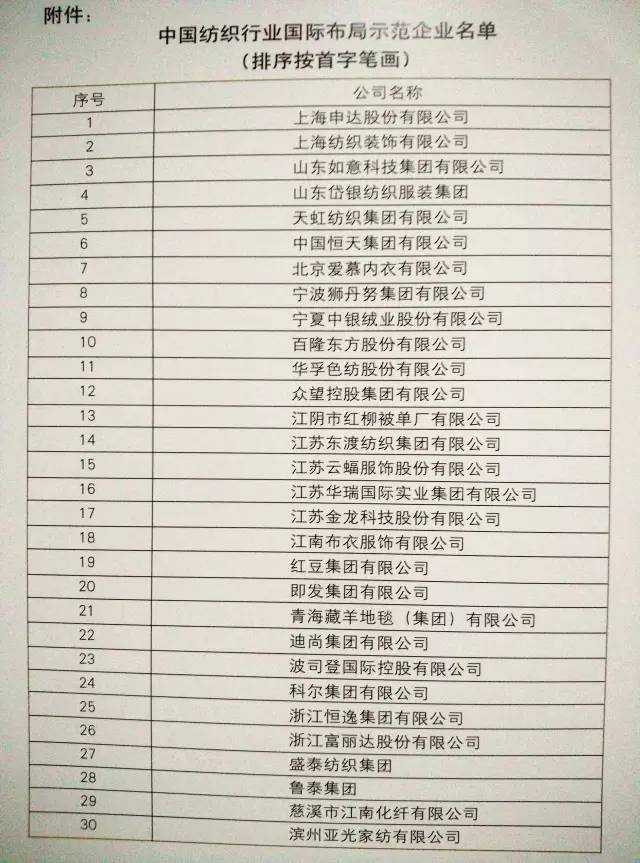 會上,中國紡織工業聯合會原副會長許坤元,副會長兼秘書長高勇,副會長楊紀朝,顧問張延愷,會長助理、中國國際貿促會紡織行業分會常務副會長徐迎新對“中國紡織行業國際布局示范企業”進行了表彰,具體名單如下: