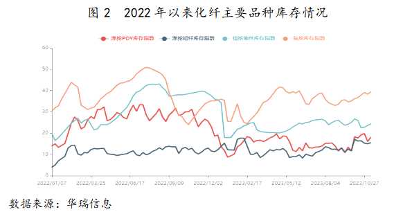 前三季度,行業整體庫存狀況良好,尤其6-9月庫存處于中低位。進入10月以來,庫存有所回升。截至10月末,滌綸POY、滌綸短纖維、錦綸的平均庫存分別約20天、15天、23天,還基本處于正常范圍,但氨綸庫存天數相對較高,已達39天。