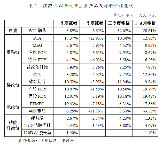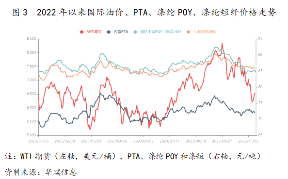 從聚酯產業鏈價格走勢看,滌綸價格基本跟隨原油價格走勢,一季度微漲,二季度下跌,三季度回升。前兩季度,原油基本保持在70-80美元/桶震蕩。三季度,受宏觀加息暫緩和沙特減產等影響,原油價格開啟上漲模式,漲幅高達32.62%,且在9月中下旬超過90美元/桶;PTA、滌綸價格跟隨原料上漲,但漲幅有限,僅上漲10%左右。10月以來,原油震蕩下跌,PTA、滌綸都跟隨下跌,目前價格已跌回二季度末低位價格。