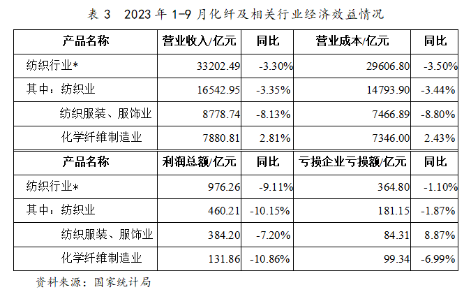前三季度,化纖行業經濟效益延續了2022年的下滑態勢,但各項效益指標呈現逐季向好趨勢,營業收入和利潤總額同比降幅逐漸收窄,虧損企業虧損額增速也呈下降趨勢。據國家統計局數據,1-9月化纖行業營業收入同比增加2.81%,自8月起,累計增速已轉正;利潤總額同比減少10.86%,降幅較1-6月收窄44.72個百分點;營收利潤率為1.67%,較1-6月提升0.51個百分點。