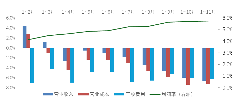 圖1. 2019-2024年(1-11月)家紡規模以上企業主要經濟指標走勢