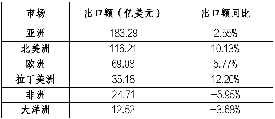 1-11月,我國對除非洲和大洋洲出口下降外,對其余各洲出口均有不同程度的增長。