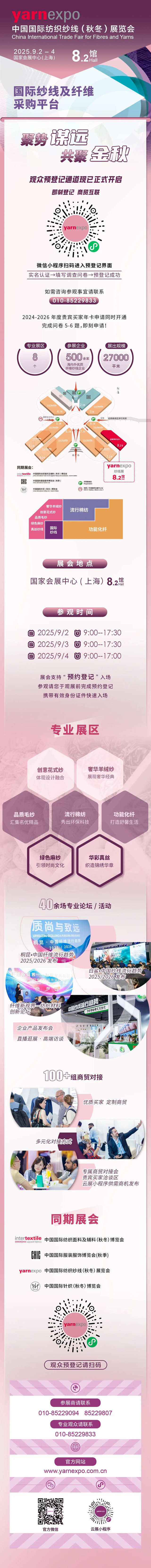 您現在的位置是:首頁 > 要聞 2025Yarn Expo秋冬紗線展 | 9月相聚上海,觀眾預登記上線 來源:yarnexpo紗線展 發布日期:2025-07-15 字體: 【小】 【中】 【大】 分享: 熱門文章: 展商專訪|金三發集團·優全股份亮相CINTE25 展示非織造... [2025-07-15] 9月上海見!2025Intertextile 秋冬面輔料展觀... [2025-07-14] 出口快訊 | 上半年全國紡織品服裝出口1439.8億美元,同... [2025-07-14] 展會服務 | CINTE25展商邀請客戶系統上線 [2025-07-11] 出訪〡共拓拉美紡織新篇(洪都拉斯) [2025-07-11] 展會直通車
