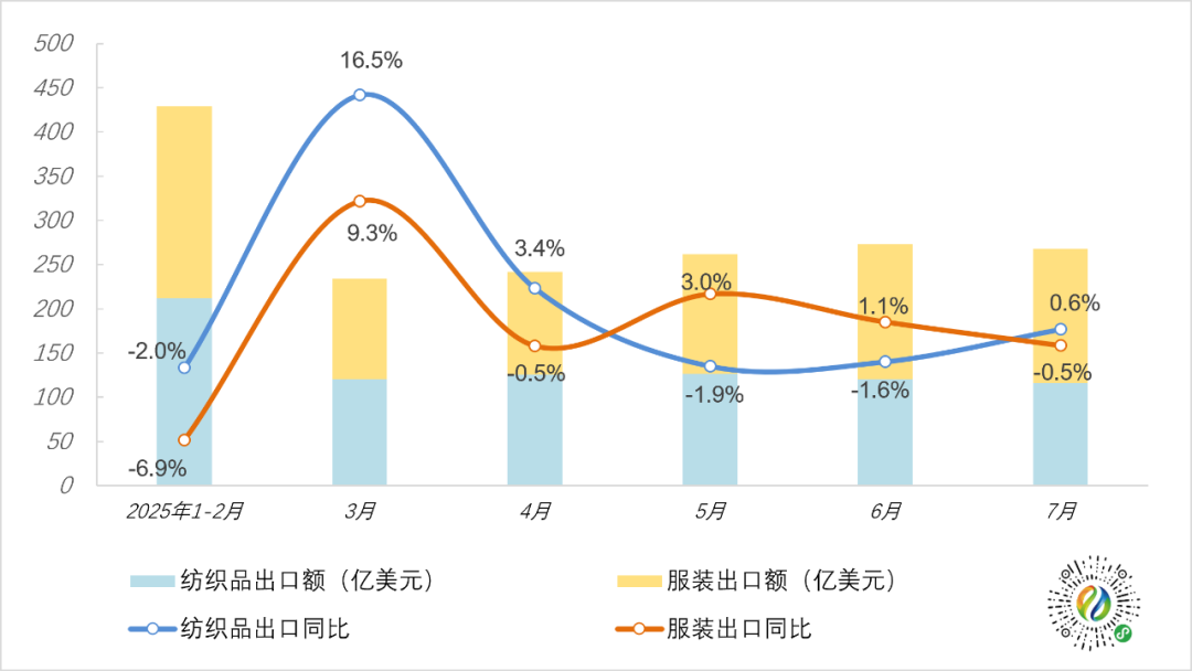 圖1 2025年1~7月全國紡織品、服裝出口月度統計